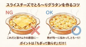 ここで、多くの方がやってしまいがちな失敗が、スライスチーズをそのままグラタンの上に1枚ポンと乗せて焼いてしまうこと。 これが、溶け残りができてしまったり、シート状に固まってしまったりする原因なんです。